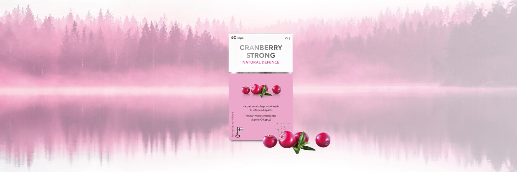 Cranberry Strong Natural Defence on apteekkien ja luontaistuotekauppojen valikoimassa. Tuote on kehitetty ja valmistettu Hämeenlinnassa.
