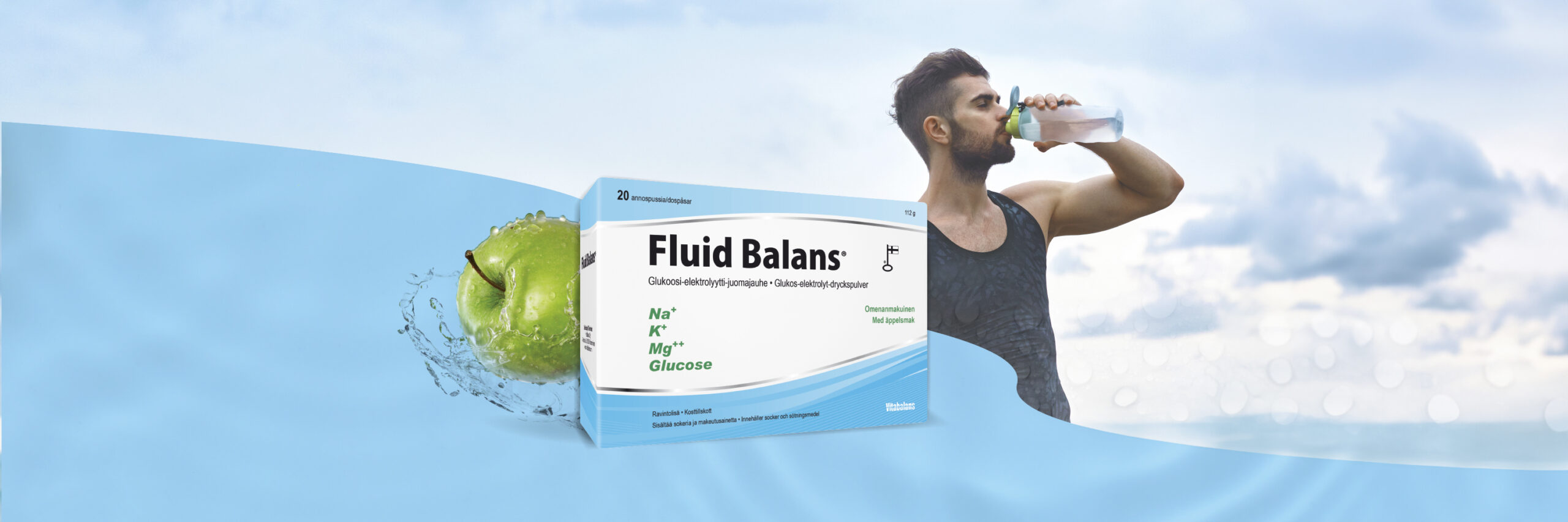 Fluid Balansissa on nestetasapainon palauttamiseen tarvittavat tärkeimmät elektrolyytit natrium, kalium, kloridi ja magnesium, sekä energiaa antavaa glukoosia. Jauhepussi liuotetaan 2,5 dl viileää vettä. Makuna raikas omena. Nauti valmista juomaa ja muita nesteitä pakkausselosteen painotaulukon annostusohjeen mukaisesti. Fluid Balans on valmistettu Suomessa.