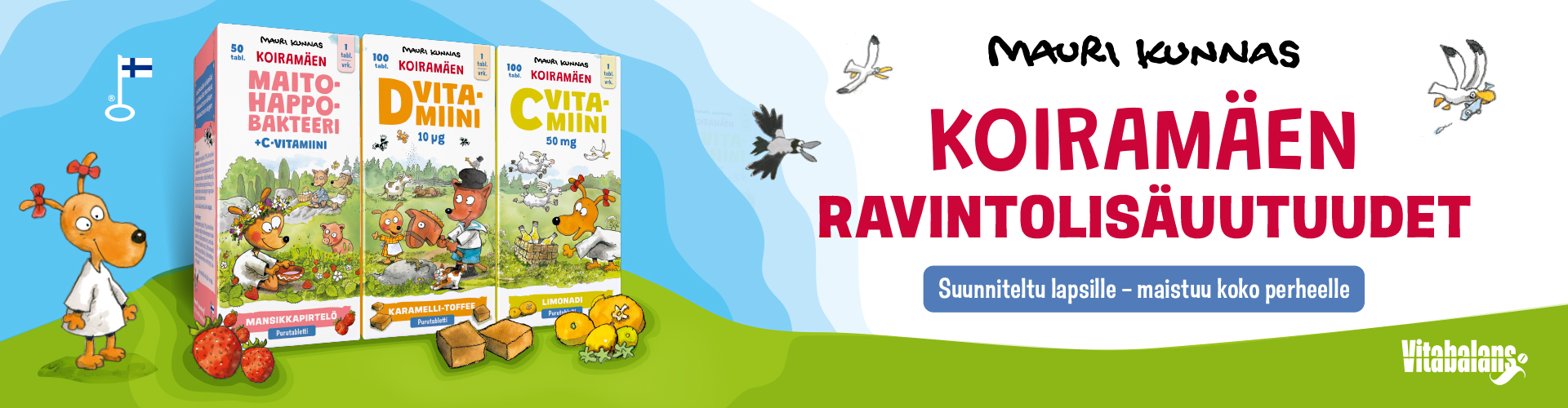 Erityisesti lasten vastustuskyvyn tukemiseen suunnitelluissa Koiramäki-tuotteissa seikkailevat rakastetut Mauri Kunnaksen Koiramäki-hahmot. Tuotesarja sisältää maukkaan mansikkapirtelön makuisen Koiramäen maitohappobakteerin, karamellitoffeen makuisen D-vitamiinin (10 µg) ja pirteän limonadin makuisen C-vitamiinin (50 mg). Kätevät ja maukkaat purutabletit on makeutettu ainoastaan hammasystävällisellä ksylitolilla ja ne sisältävät vain luonnollisia aromeja, eikä niihin ole lisätty mitään ylimääräistä.